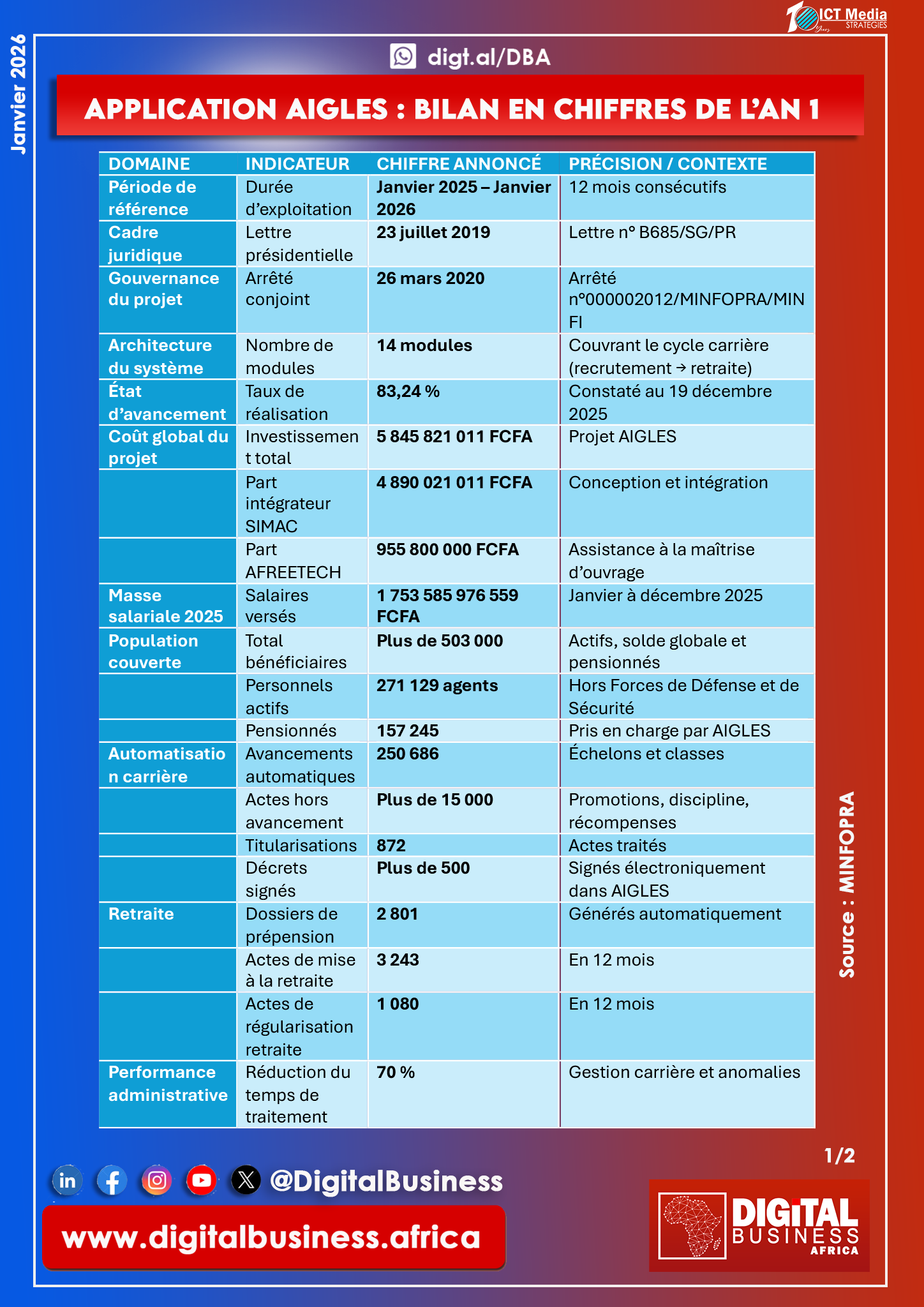 [DIGITAL Business Africa] – Un an après son entrée en production effective, l’Application Informatique de Gestion Logique des Effectifs et de la Solde (AIGLES) s’impose, chiffres à l’appui, comme l’une des réformes numériques les plus structurantes de l’administration publique camerounaise.