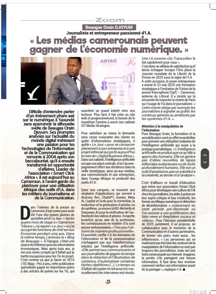 Dans sa dernière édition de septembre 2025, MINCOM News, le magazine officiel du ministère de la Communication du Cameroun, met en lumière les initiatives d’ICT Media STRATEGIES. Une reconnaissance du rôle que joue le cabinet dans la transformation numérique du paysage médiatique et institutionnel au Cameroun. Retrouvez ici l’interview de DJOYUM Beaugas Orain, expert en e-réputation, en veille stratégique et en Personal branding et par ailleurs président de l’association Smart Click Africa.