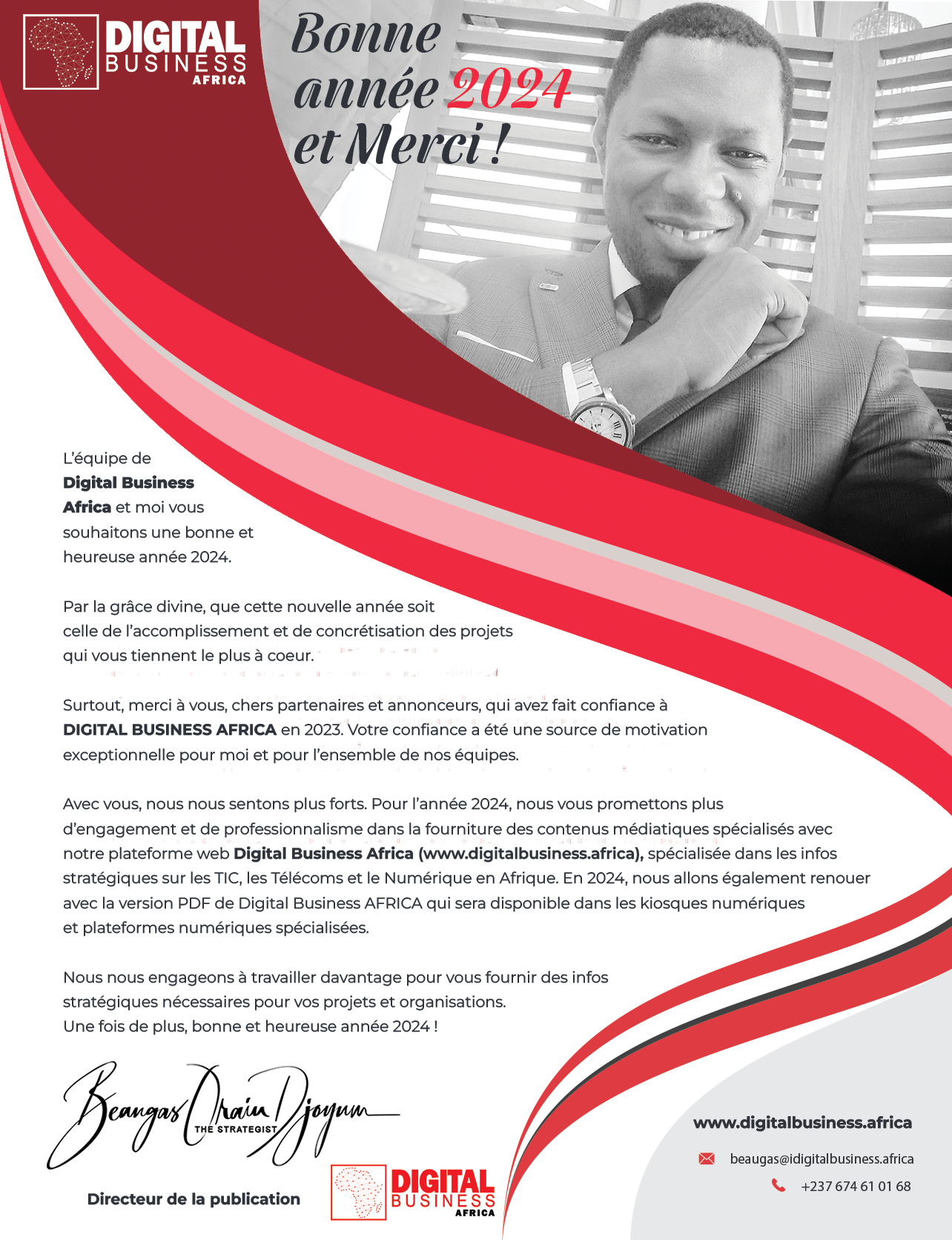 En 2024, nous allons également renouer avec la version PDF de Digital Business AFRICA qui sera disponible dans les kiosques numériques et plateformes numériques spécialisées. Nous nous engageons à travailler davantage pour vous fournir des infos stratégiques nécessaires pour vos projets et organisations. Une fois de plus, bonne et heureuse année 2024 !