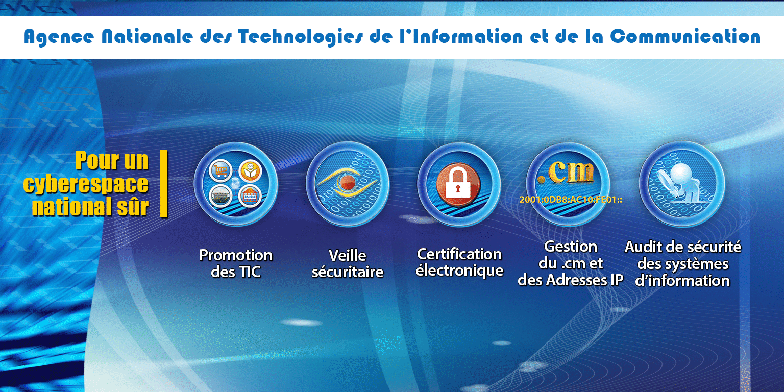 Dans l’accomplissement de ses diverses missions, l’Agence s’est dotée de diverses divisions techniques et structures d’accompagnement pour l’assister dans ses missions variées que sont : l’audit de sécurité des systèmes d’information, la veille sécuritaire, la certification électronique, la promotion des TIC, la Régulation de l’Internet à travers la gestion des ressources de nommage en “.cm” et des adresses IP.