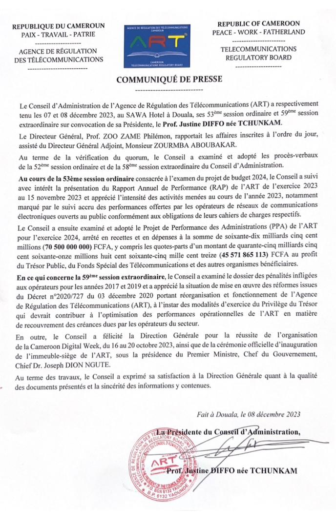[DIGITAL Business Africa] – Le communiqué intégral du CA. Conseil d’Administration de l’Agence de Régulation des Télécommunications (ART) a respectivement tenu les 07 et 08 septembre 2023, au SAWA Hotel à Douala, ses 53e session ordinaire et 59e session extraordinaire sur convocation de sa Présidente, le Prof. Justine DIFFO née TCHUNKAM.