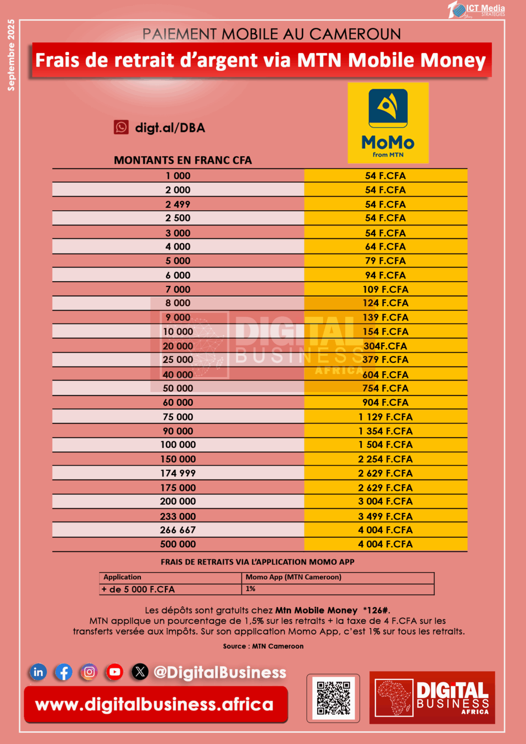 Toutefois, cette tarification à 1 % ne concerne que les retraits effectués via l’application MoMo App. En dehors de cette application, notamment via le code USSD *126#, MTN continue d’appliquer une tarification classique composée d’un taux de 1,5 % sur le montant à retirer, auquel s’ajoute une taxe forfaitaire de 4 F.CFA reversée à l’État du Cameroun.