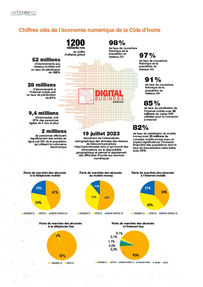 Pour ce qui est des parts de marché des abonnés à la téléphonie mobile, Orange CI est leader avec 47% des parts de marché, suivi de MTN CI (34%) et de Moov Africa CI (19%). Idem sur les parts de marché des abonnements mobile money où Orange CI domine largement le marché avec 54% des parts de marché, suivi de MTN CI (35%) et de Moov Africa CI (11%).