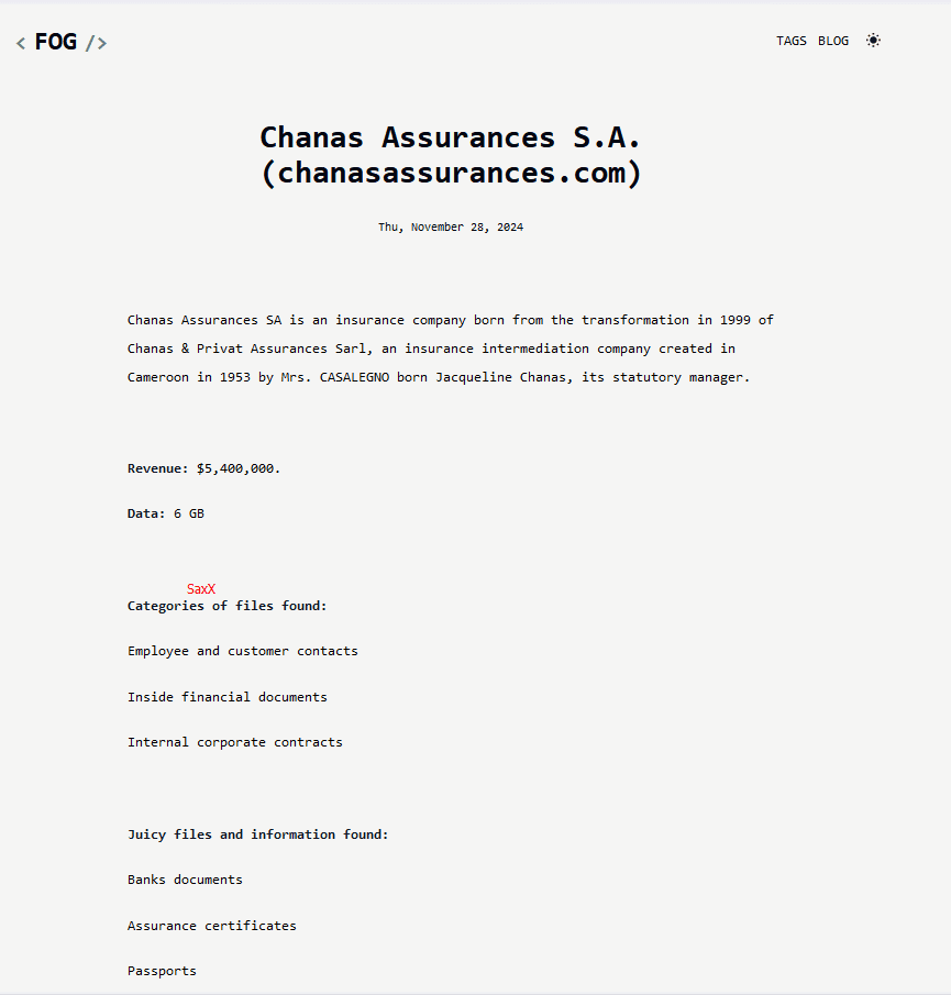 [Digital Business Africa] – Chanas Assurances S.A., un acteur majeur du marché camerounais de l’assurance non-vie, a été la cible d’une cyberattaque menée par le groupe de ransomware “Fog” qui demande une rançon. C’est ce que soutient le hacker éthique Saax actif sur X et reconnu pour la veille qu’il fait sur le piratage des données des entreprises.