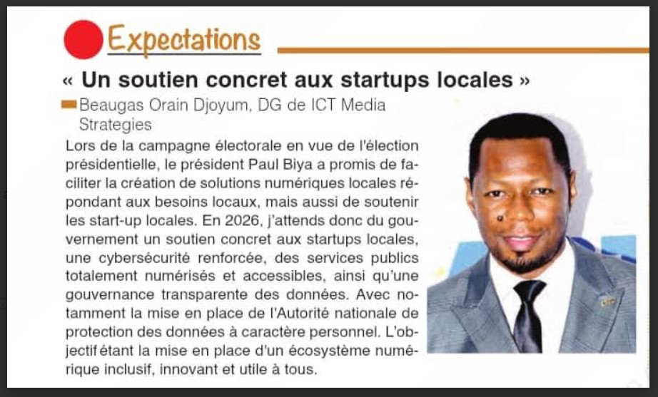 [Digital Business Africa] – Dans l’édition du 30 décembre 2025 de Cameroon Tribune, je plaide pour un soutien concret aux startups locales, une cybersécurité renforcée, des services publics totalement numérisés et accessibles, ainsi qu’une gouvernance transparente des données personnelles, avec la mise en place effective de l’Autorité nationale de protection des données à caractère personnel.