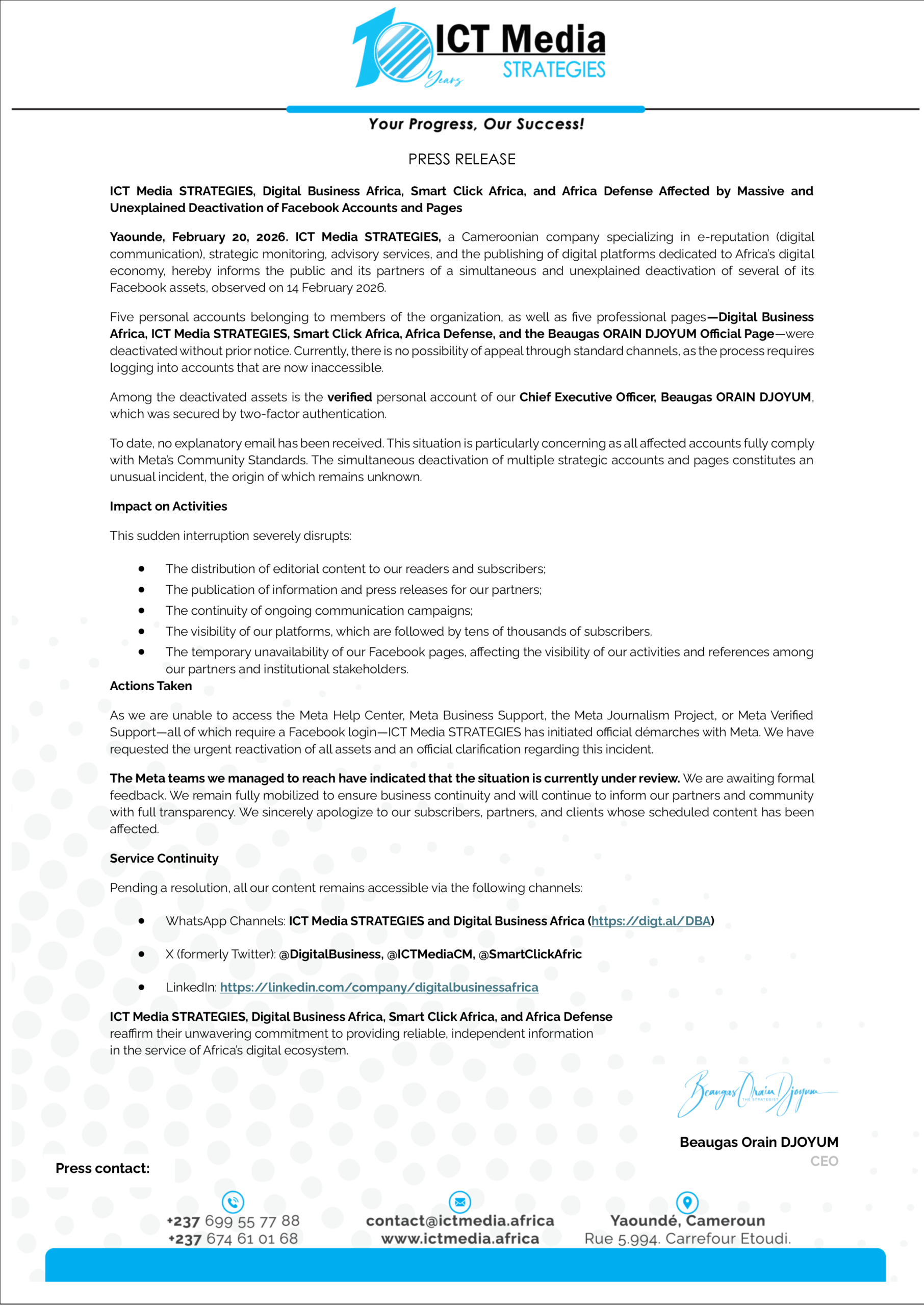 [ICT Media STRATEGIES] – Yaounde, February 20, 2026. ICT Media STRATEGIES, a Cameroonian company specializing in e-reputation (digital communication), strategic monitoring, advisory services, and the publishing of digital platforms dedicated to Africa’s digital economy, hereby informs the public and its partners of a simultaneous and unexplained deactivation of several of its Facebook assets, observed on 14 February 2026.