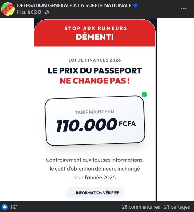Bien que cette information ait été démenti tant par le ministère que les journaux tel Digital Business Africa, une autre a refait surface, le cout du passeport biométrique qui serait passé de 110 000 à 155 000 FCFA, ce qui est faux. Après lecture de la loi N 2025/ 012 du 17 Décembre 2025 portant loi de finance de la république du Cameroun pour l’exercice 2026, le constat est clair, le tarif reste inchangé.