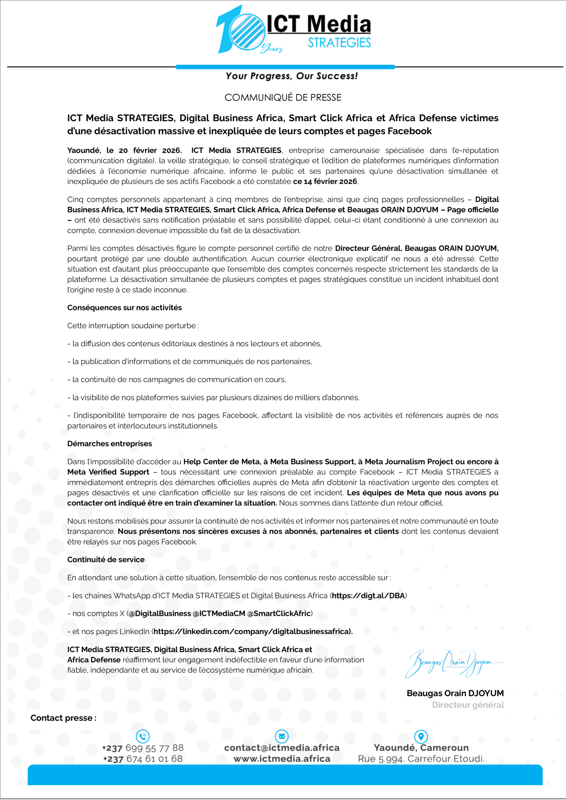 [ICT Media STRATEGIES] – Yaoundé, le 20 février 2026. ICT Media STRATEGIES, entreprise camerounaise spécialisée dans l’e-réputation (communication digitale), la veille stratégique, le conseil stratégique et l’édition de plateformes numériques d’information dédiées à l’économie numérique africaine, informe le public et ses partenaires qu’une désactivation simultanée et inexpliquée de plusieurs de ses actifs Facebook a été constatée ce 14 février 2026.