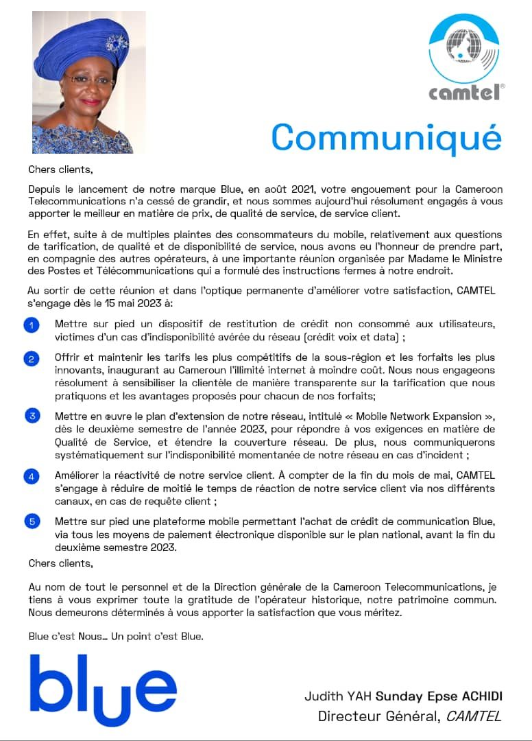 [DIGITAL Business Africa] – La lettre de Judith Yah Sunday épse ACHIDI, DG de Camtel, à ses abonnés ce 13 mai 2023.