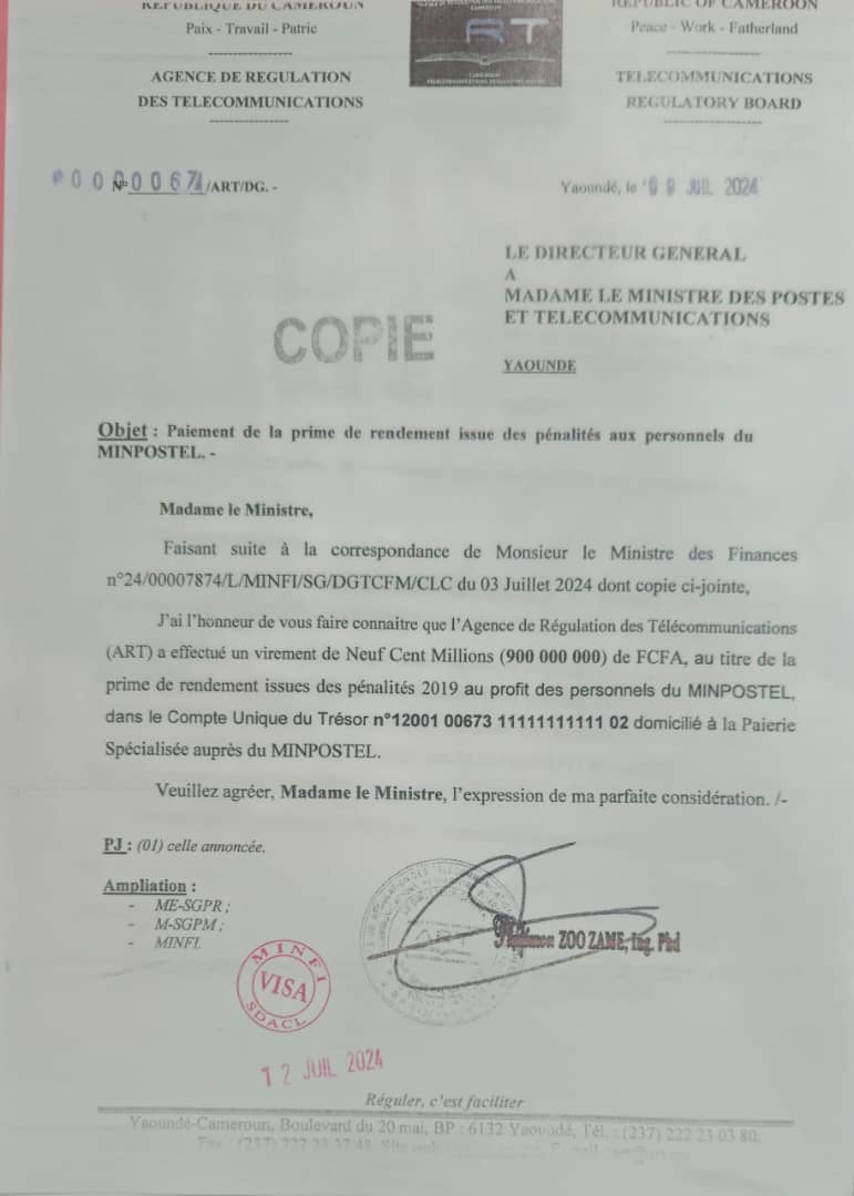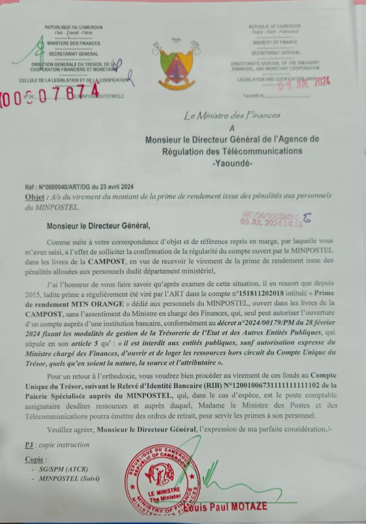 Il se trouve que, par le passé, l’ART virait cette prime dans le compte n° 151811202018 intitulé « Prime de rendement MTN ORANGE » dédié aux personnels du MINPOSTEL, ouvert dans les livres de la CAMPOST. Ceci « sans l’assentiment du Ministre en charge des Finances, qui, seul peut autoriser l’ouverture d’un compte auprès d’une institution bancaire », précise Louis-Paul Motaze dans sa correspondance du 03 juillet 2024 au DG de l’ART, le Pr Philémon Zoo Zame.