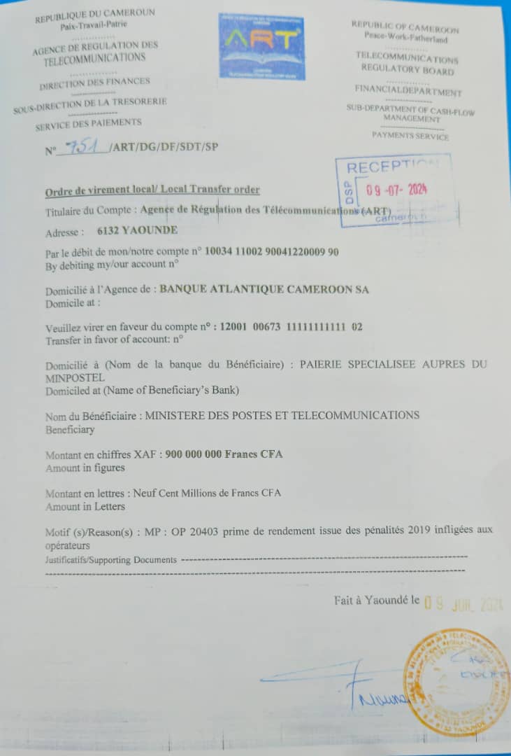 C’est ce qui ressort du document transféré au Minpostel donnant les détails de l’ordre de virement daté du 09 juillet 2024, présenté par les responsables de l’ART, contactés par Digital Business Africa.