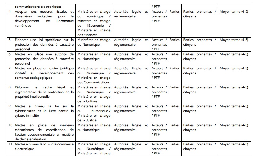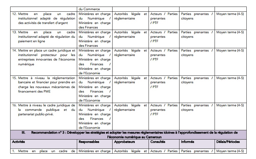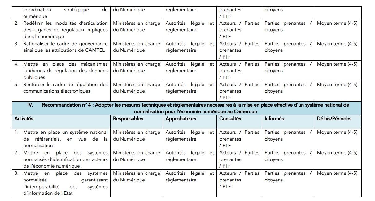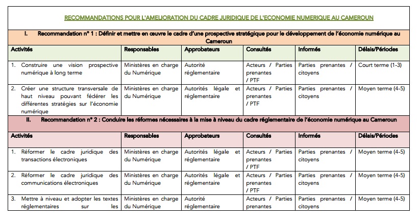 Ces quatre grandes recommandations sont : la définition et la mise en œuvre d’un cadre d’une prospective stratégique pour le développement de l’économie numérique au Cameroun ; la conduite des réformes nécessaires à la mise à niveau du cadre réglementaire de l’économie numérique ; le développement des stratégies et l’adoption des mesures réglementaires idoines à l’approfondissement de la régulation de l’économie numérique et enfin l’adoption des mesures techniques et réglementaires nécessaires à la mise en place effective d’un système national de normalisation pour l’économie numérique.