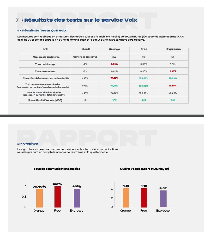 Au total, après Free, Orange arrive en deuxième position, affichant d’excellentes performances avec un taux de réussite de 99,18% pour les appels et de 96,40% pour les données. Expresso, quant à lui, ferme la marche avec des résultats moins satisfaisants, notamment pour les données mobiles.