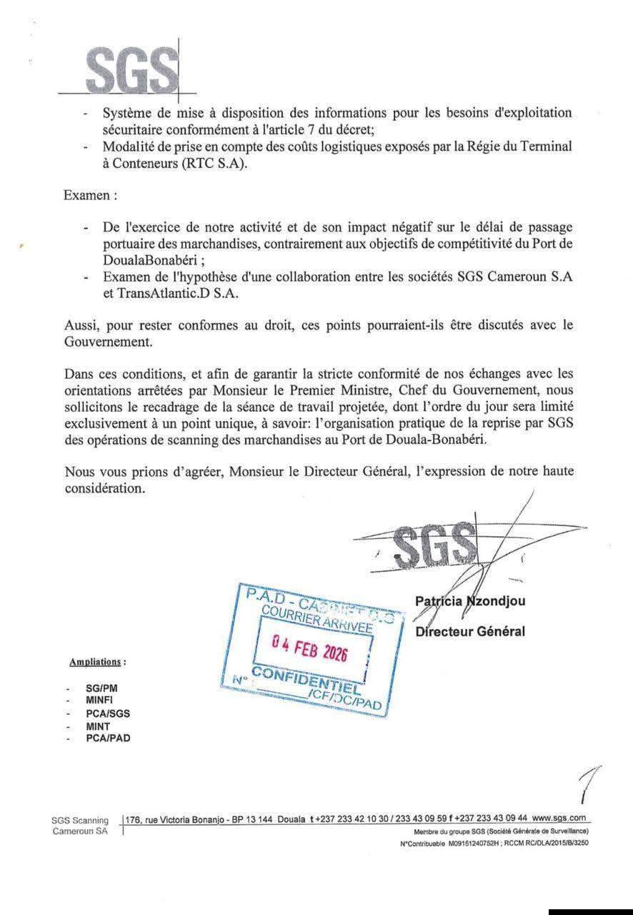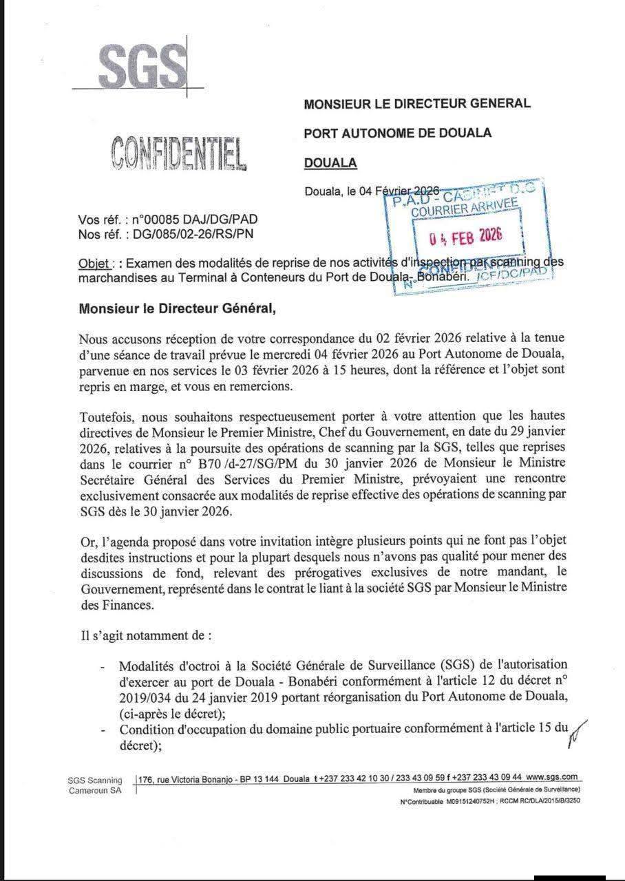 Quelques jours avant la correspondance de SGS, le Directeur général du PAD avait officiellement saisi la Directrice générale de SGS Cameroun S.A. pour l’inviter à une séance de travail au Port autonome de Douala, le 04 février 2026.
