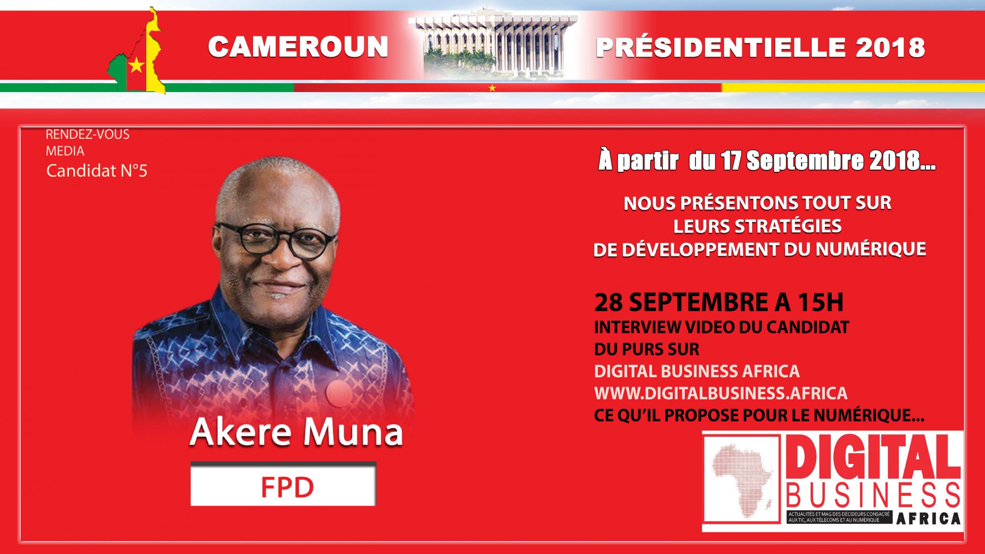 (Digital Business Africa) – La plateforme web TIC Mag (www.ticmag.net) qui a récemment migré vers l’appellation DIGITAL Business Africa (www.digitalbusiness.africa), magazine des décideurs consacré aux informations stratégiques sur les TIC, les Télécoms et le Numérique en Afrique, a entrepris d’interroger en interview vidéo les neuf candidats à l’élection présidentielle du 07 octobre 2018 au Cameroun. Digital Business Africa les a invité à parler du numérique et à exposer leurs propositions pour un meilleur développement du numérique au Cameroun. Quatrième arrêt ce 24 septembre 2018, Maurice Kamto, le candidat du parti MRC (Mouvement pour la Renaissance du Cameroun).