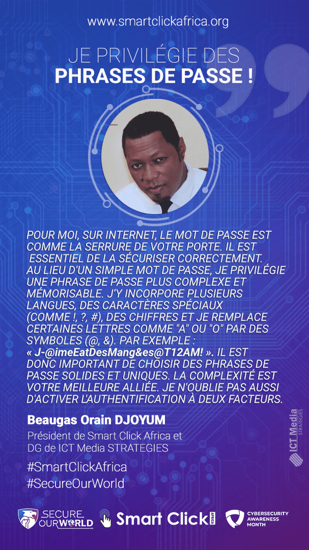 Cameroun sont estimés à plusieurs milliards de francs CFA : 12,2 milliards de francs CFA pour la seule année 2021. C’est pourquoi il est important de sensibiliser et de présenter quelques bonnes pratiques non seulement aux internautes, mais aussi aux différentes organisations. L’ association Smart Click Africa qui œuvre pour un meilleur développement numérique, un Internet utile, sain et sûr, et pour une meilleure utilisation du web, a choisi ce mois d’octobre pour mettre l’accent sur la sensibilisation », déclare Beaugas-Orain DJOYUM.
