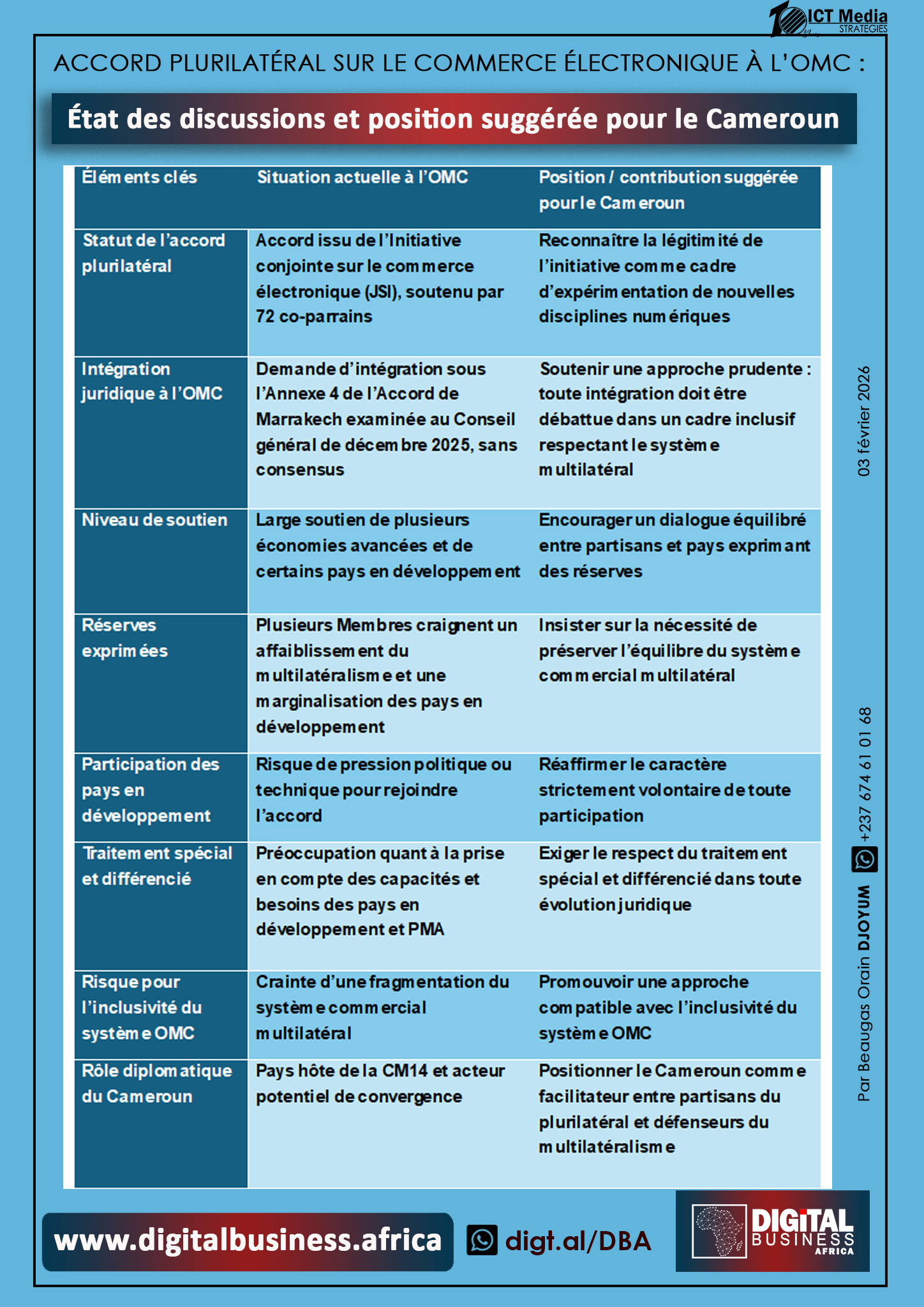À quelques semaines de la CM14 à Yaoundé, le Cameroun dispose ainsi d’une fenêtre diplomatique importante pour contribuer à un débat plus mature, plus informé et plus équitable sur l’avenir du commerce électronique.