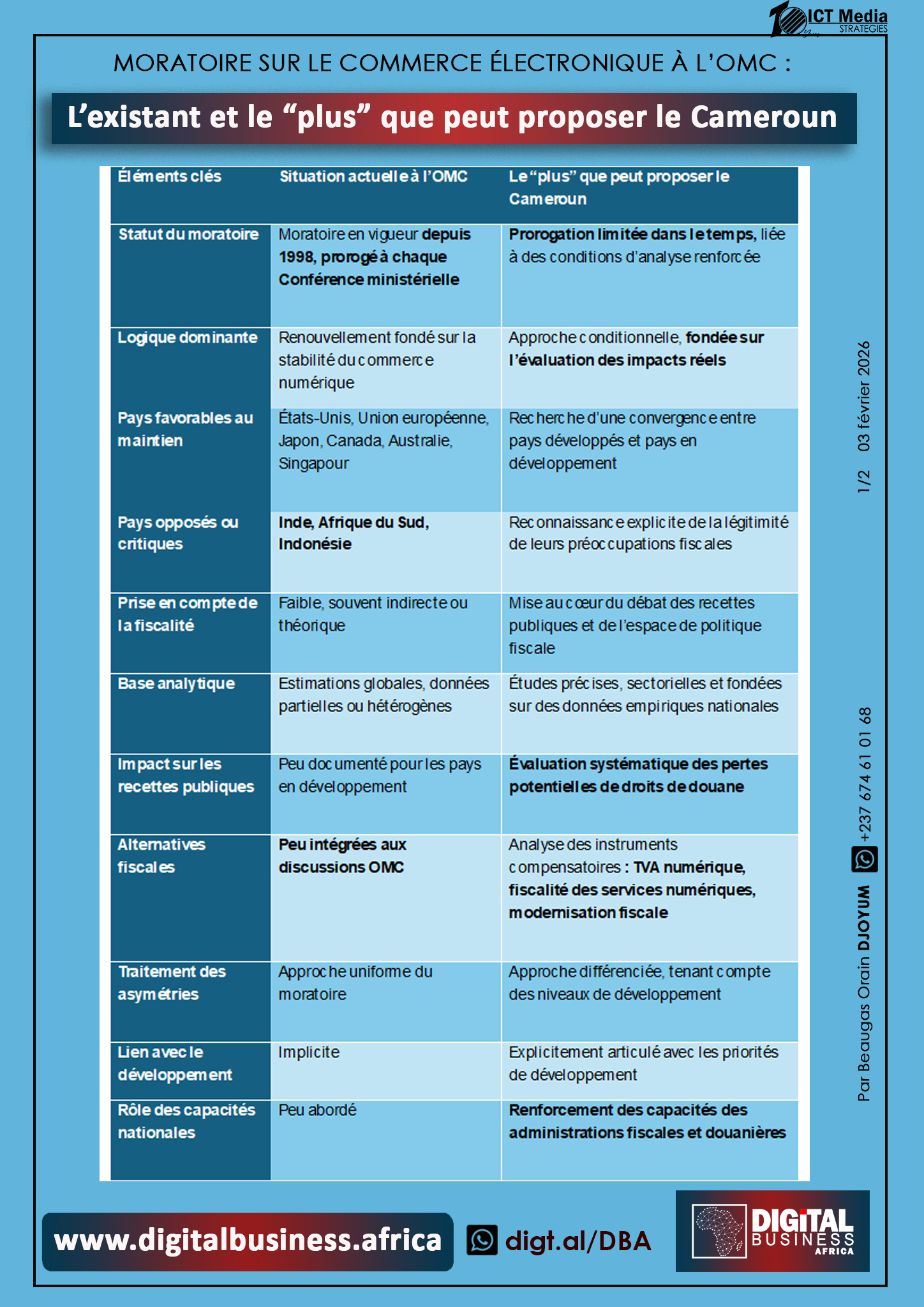 L’approche proposée par le Cameroun ne remet pas en cause le moratoire sur le commerce électronique, mais vise à en sortir la discussion du face-à-face idéologique en plaçant la fiscalité numérique, les recettes publiques et l’analyse fondée sur les données au cœur du processus décisionnel multilatéral.