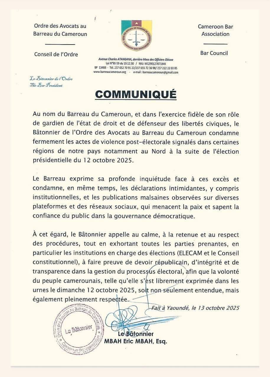 Le bâtonnier Maître Mbah Éric Mbah a signé un communiqué ce 13 octobre 2025 dans lequel il condamne « fermement les actes de violence postélectorale signalés dans certaines régions du pays ».