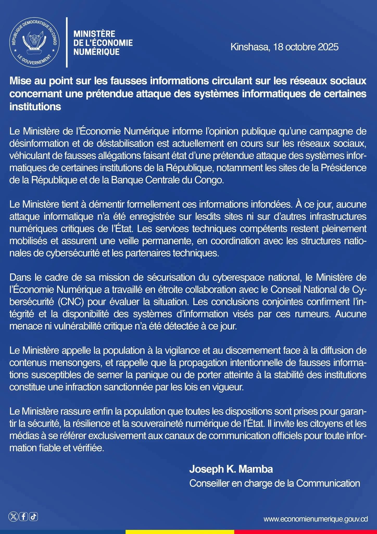 [DIGITAL Business Africa] – Aucune cyberattaque des institutions étatiques détectée. C’est l’assurance que donne le ministère de l’Économie numérique via un communiqué publié ce 18 octobre 2025. Joseph Kazadi Mamba, conseiller en charge de la Communication au ministère de l’Économie numérique, a démenti une prétendue « attaque informatique » des institutions républicaines.