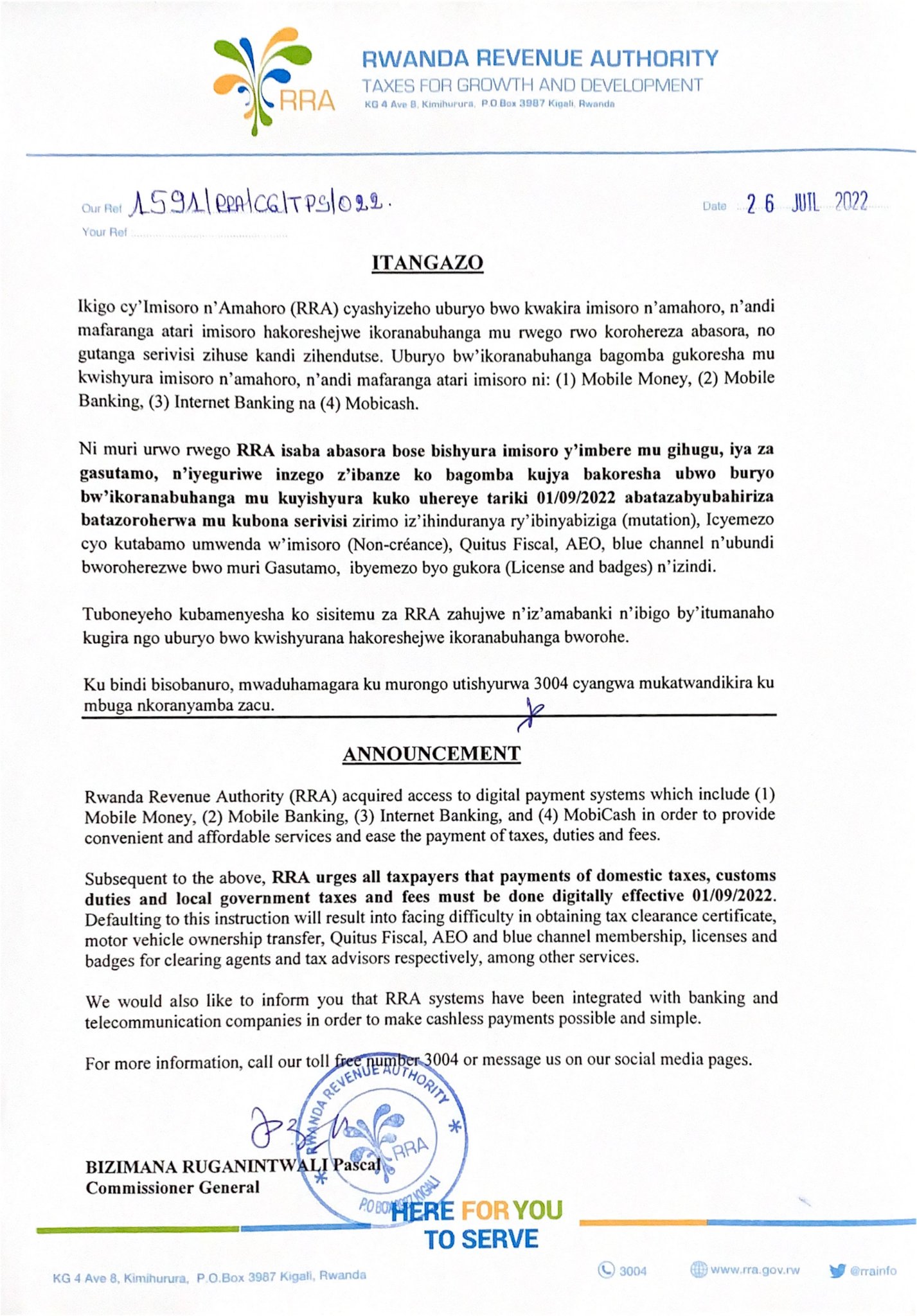 Le commissaire général de la RRA, Pascal Bizimana Ruganintwali, qui l’a annoncé ce 26 juillet 2022 indique que la RRA a acquis des systèmes de paiement numérique qui comprennent la réception des paiements de manière fluide et abordable via Mobile Money, Mobile Banking, Internet Banking et MobiCash.