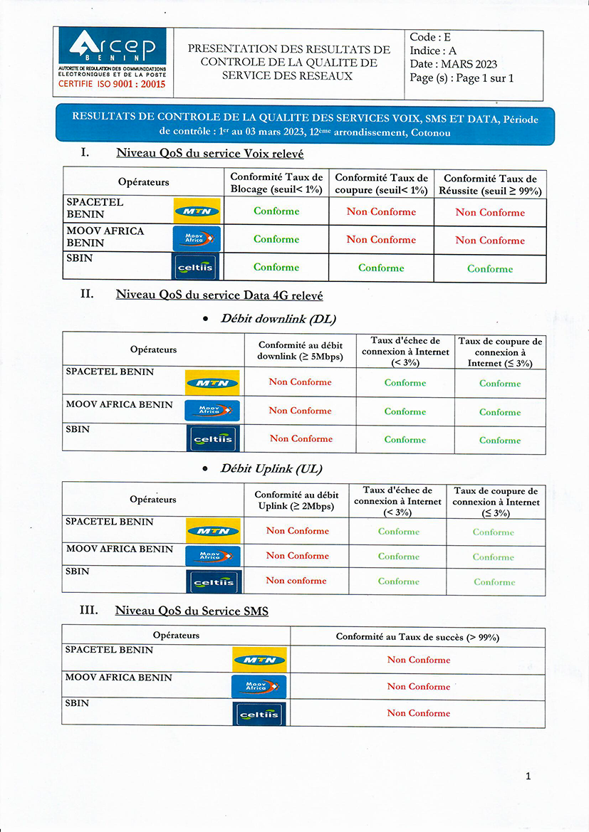D’après les résultats de ce contrôle, les services 4G de MTN Bénin, de SBIN et de Moov Africa Bénin ne sont pas conformes aux débits exigés. Voir les résultats du contrôle: