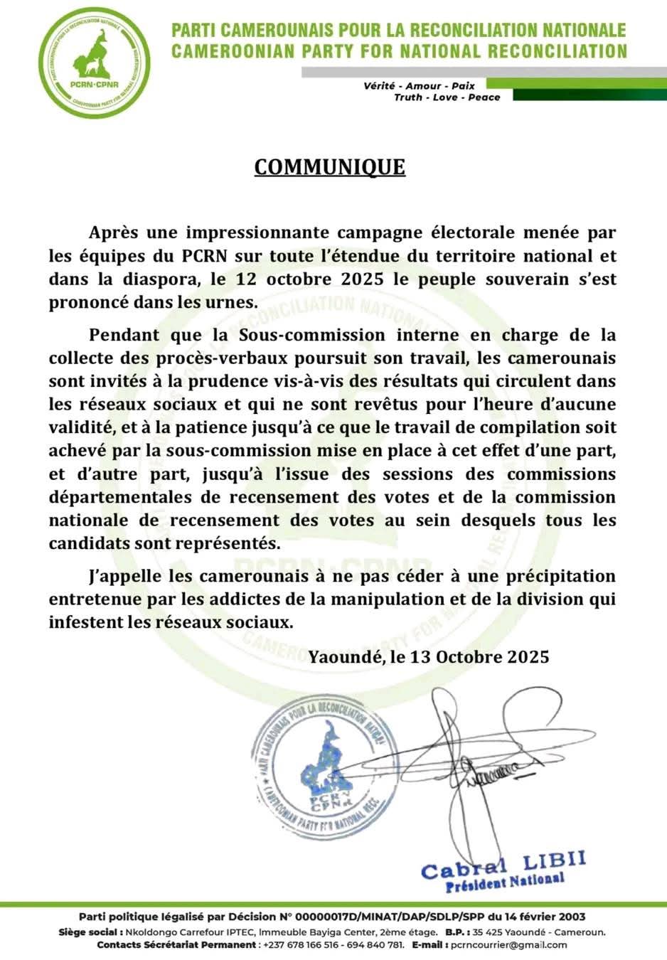 Cabral Libii, candidat du PCRN, lui aussi a commis un communiqué ce 13 octobre 2025 où il exhorte le peuple à plus de prudence vis-à-vis de ces résultats qui circulent sur les réseaux.