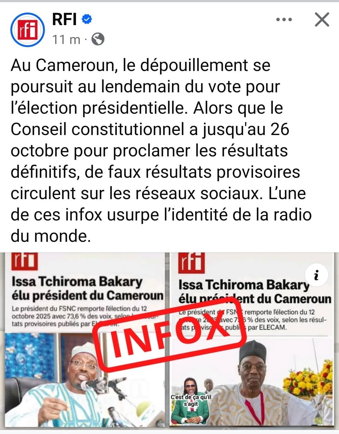 Informé de cette manipulation volontaire de ce journaliste qui plus est est DG d’une chaîne de télévision, RFI a mis en garde ses abonnés. Surtout qu’un faux compte à son nom a publié que Issa Tchiroma Bakary a remporté le scrutin avec 73 %.