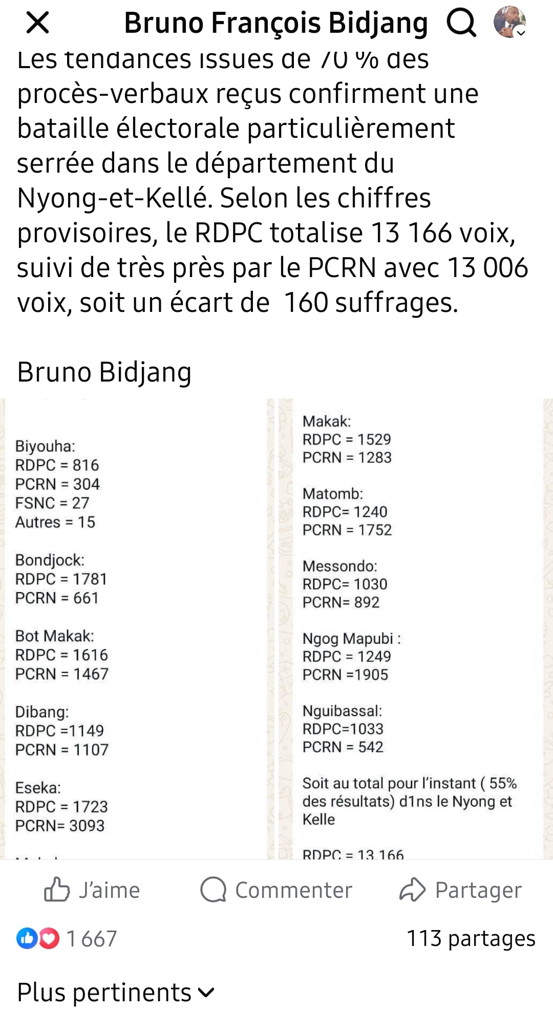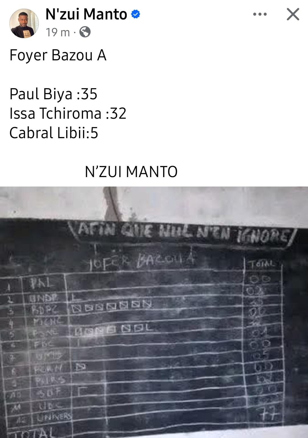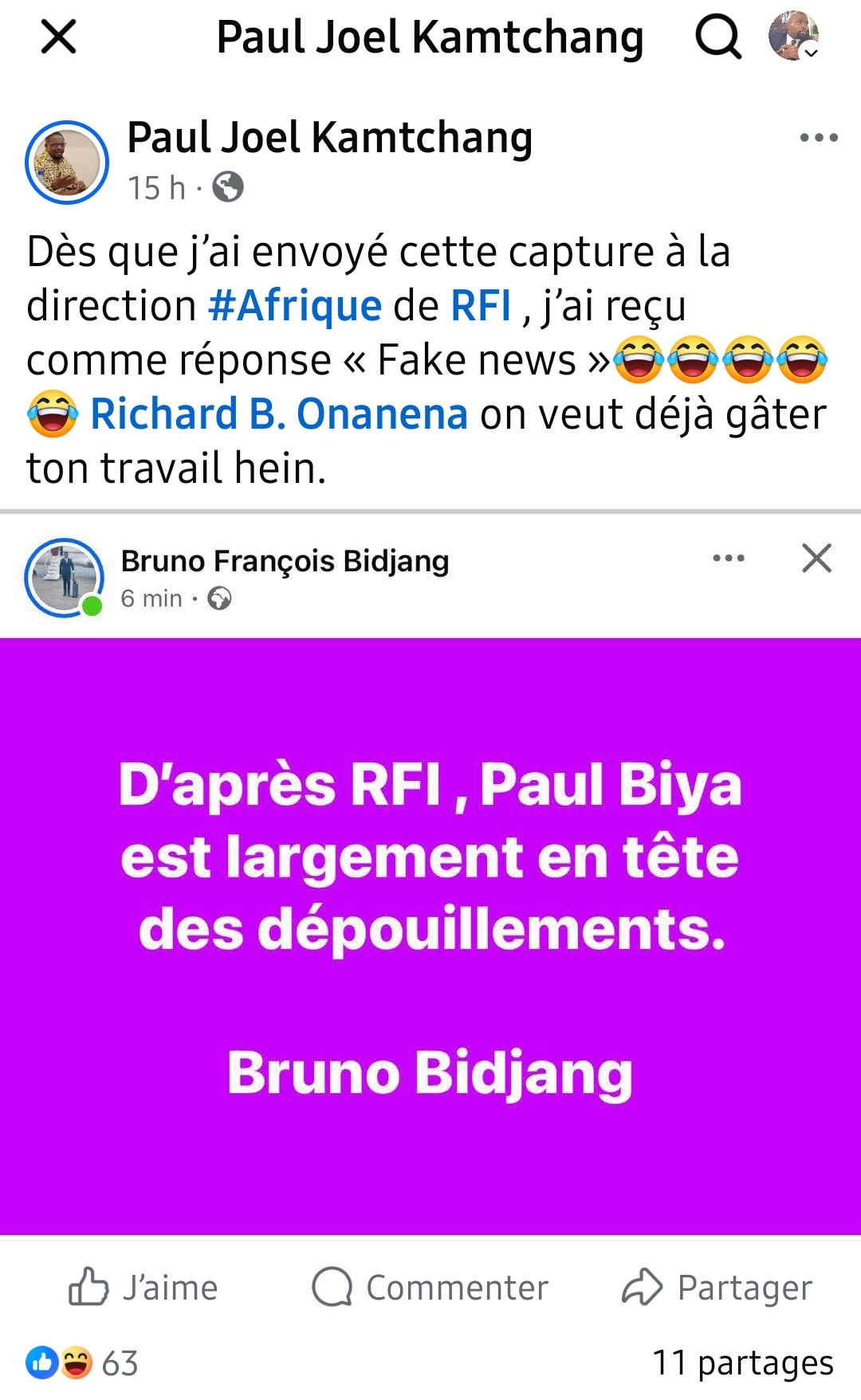 Ce qui a fait dire à l’un d’eux, Bruno Bidjang, sur son mur que Paul Biya « vient en tête des dépouillements ». En citant comme source le média français RFI.